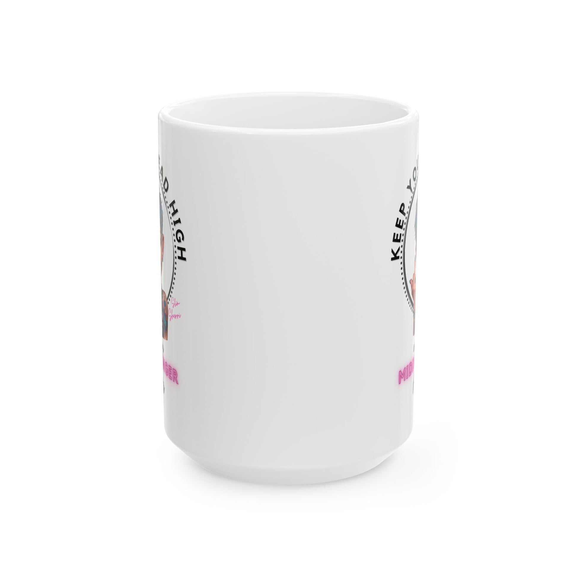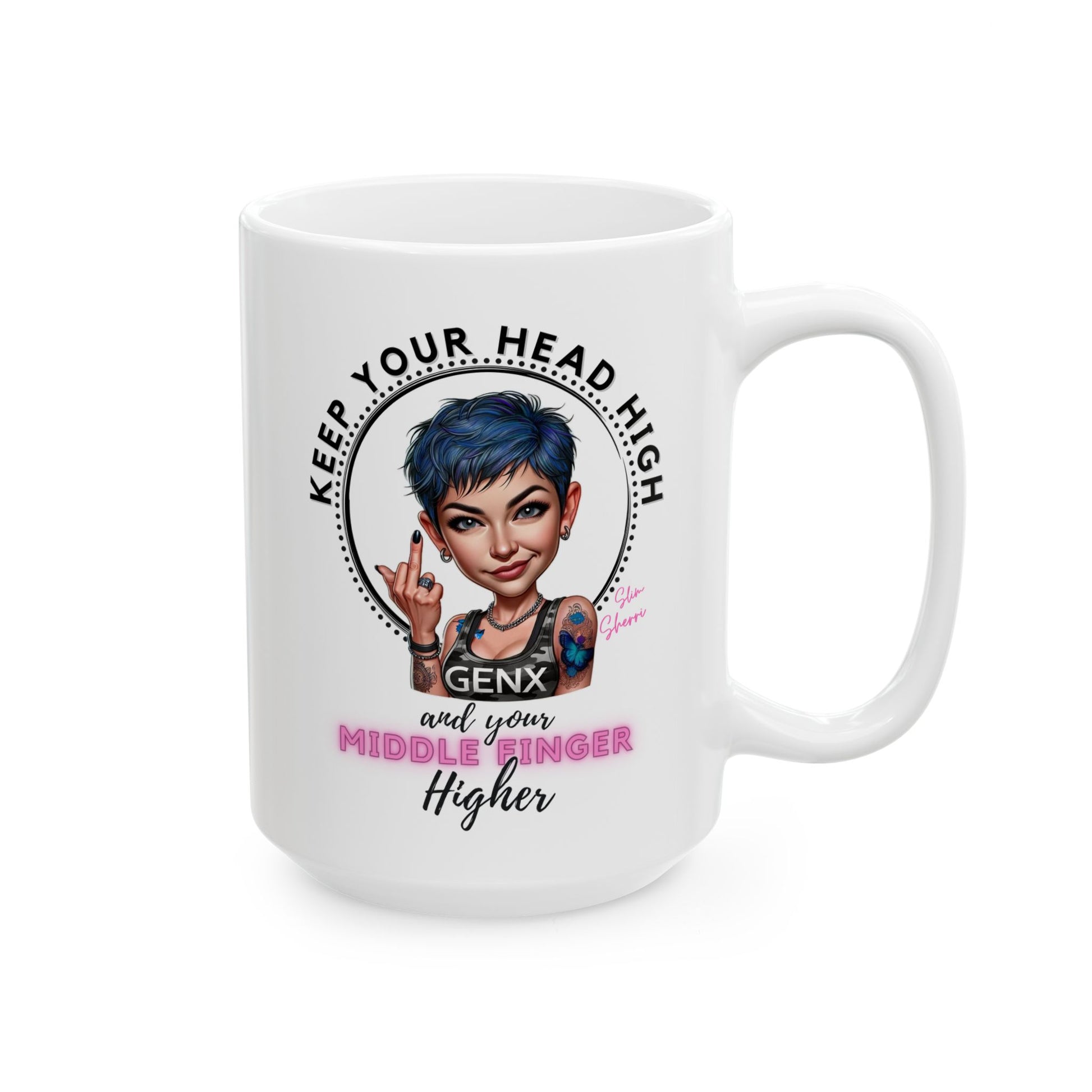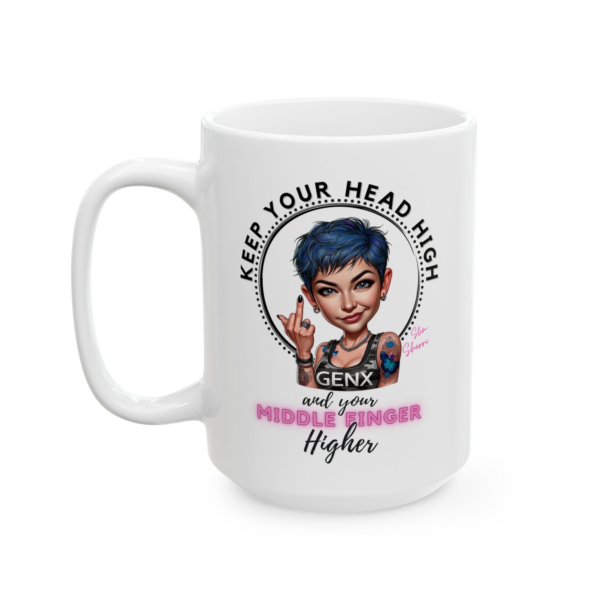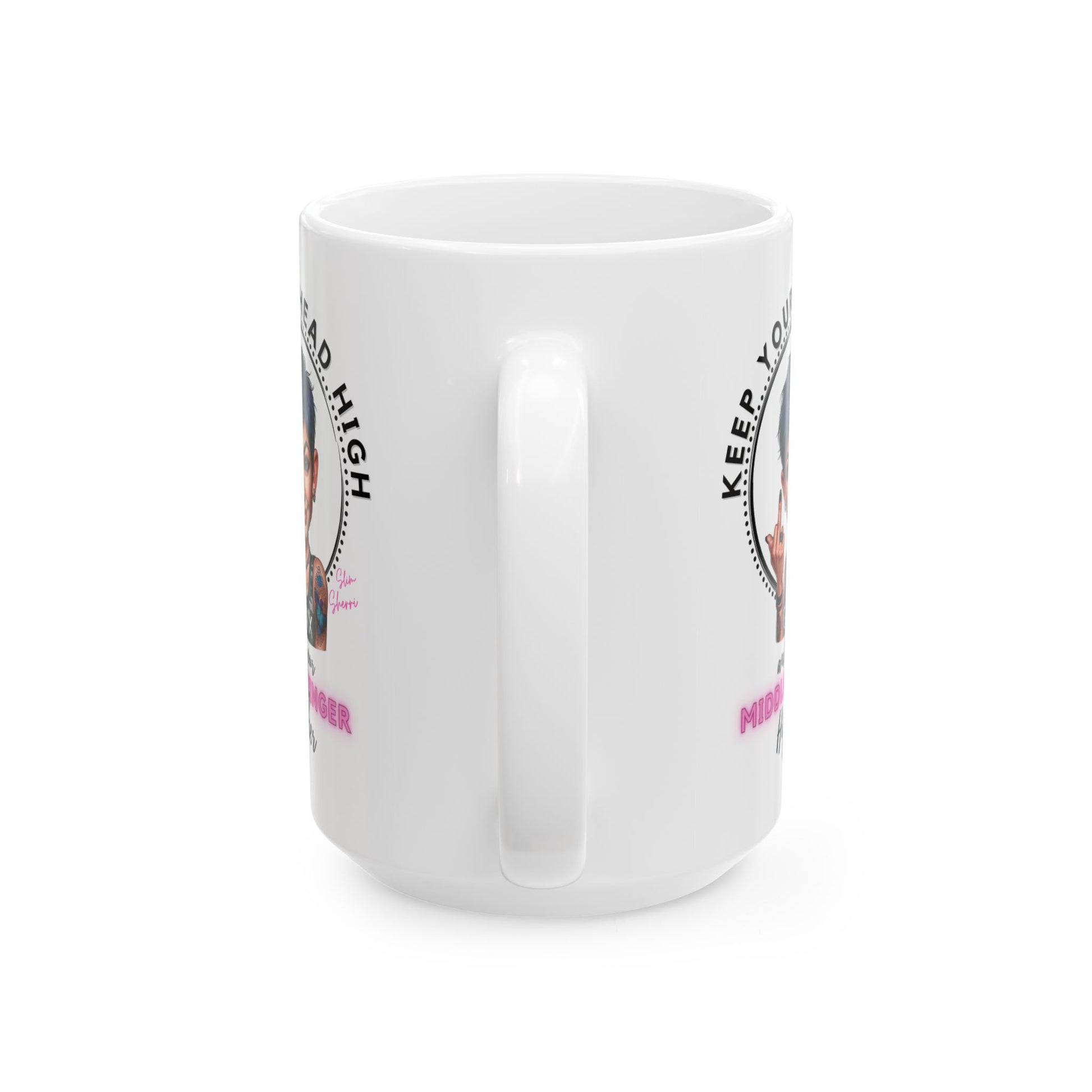 Introducing the ultimate coffee mug for those who like their caffeine with a side of attitude! Featuring Slim Sherri, this 15oz mug boldly proclaims, "Keep Your Head High and Your Middle Finger Higher." It's more than just a vessel for your favorite brew—it's a statement.